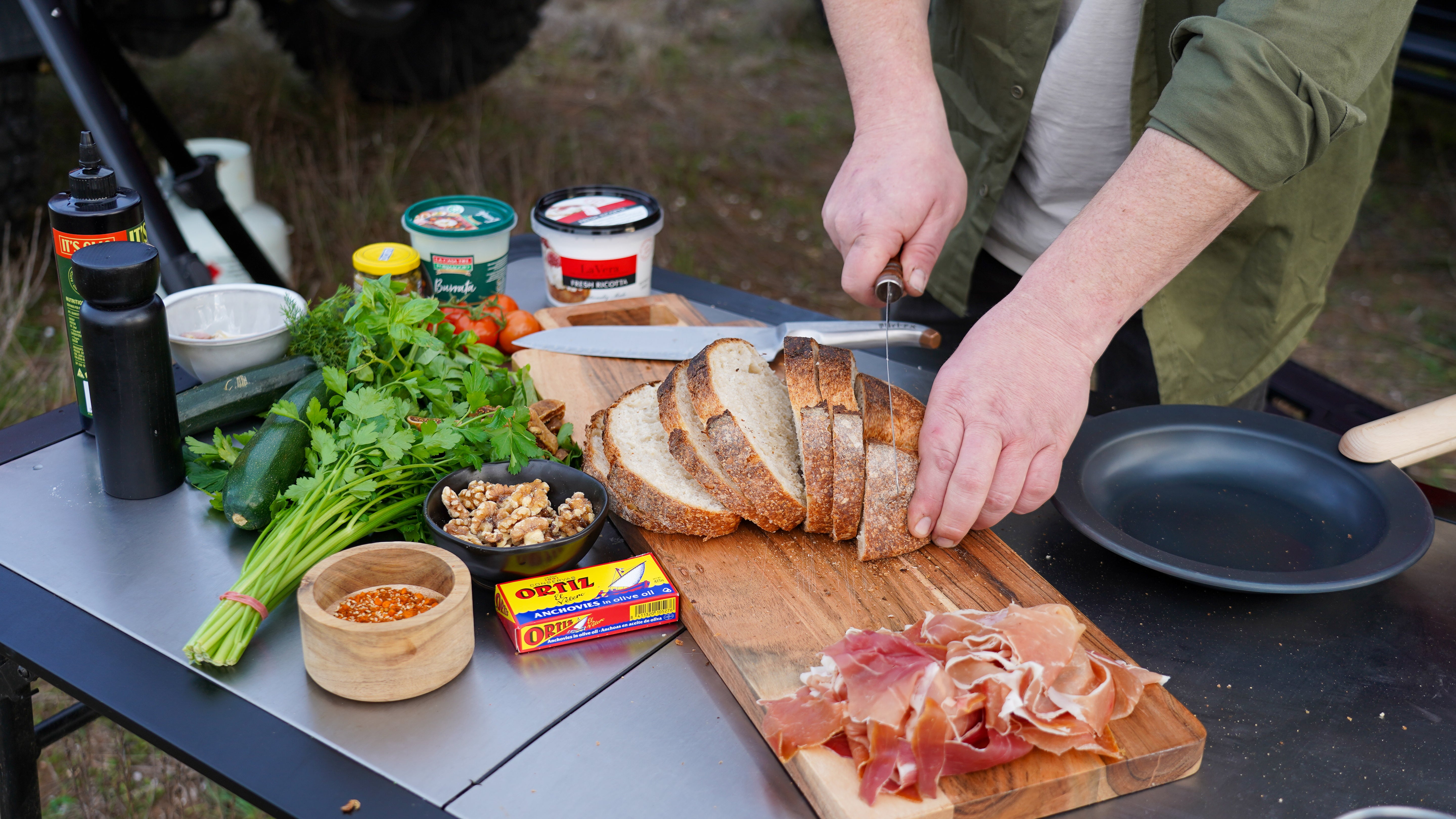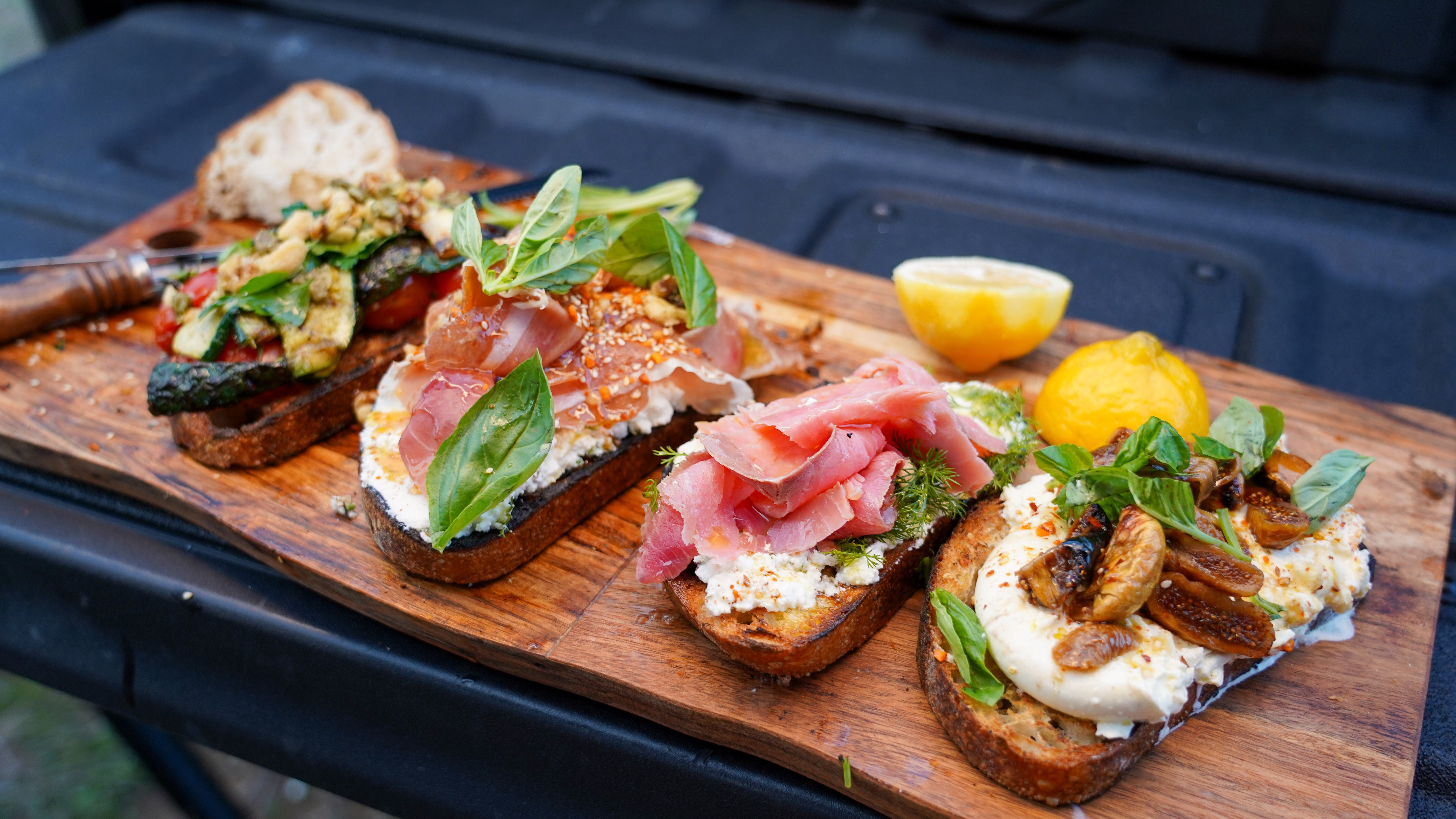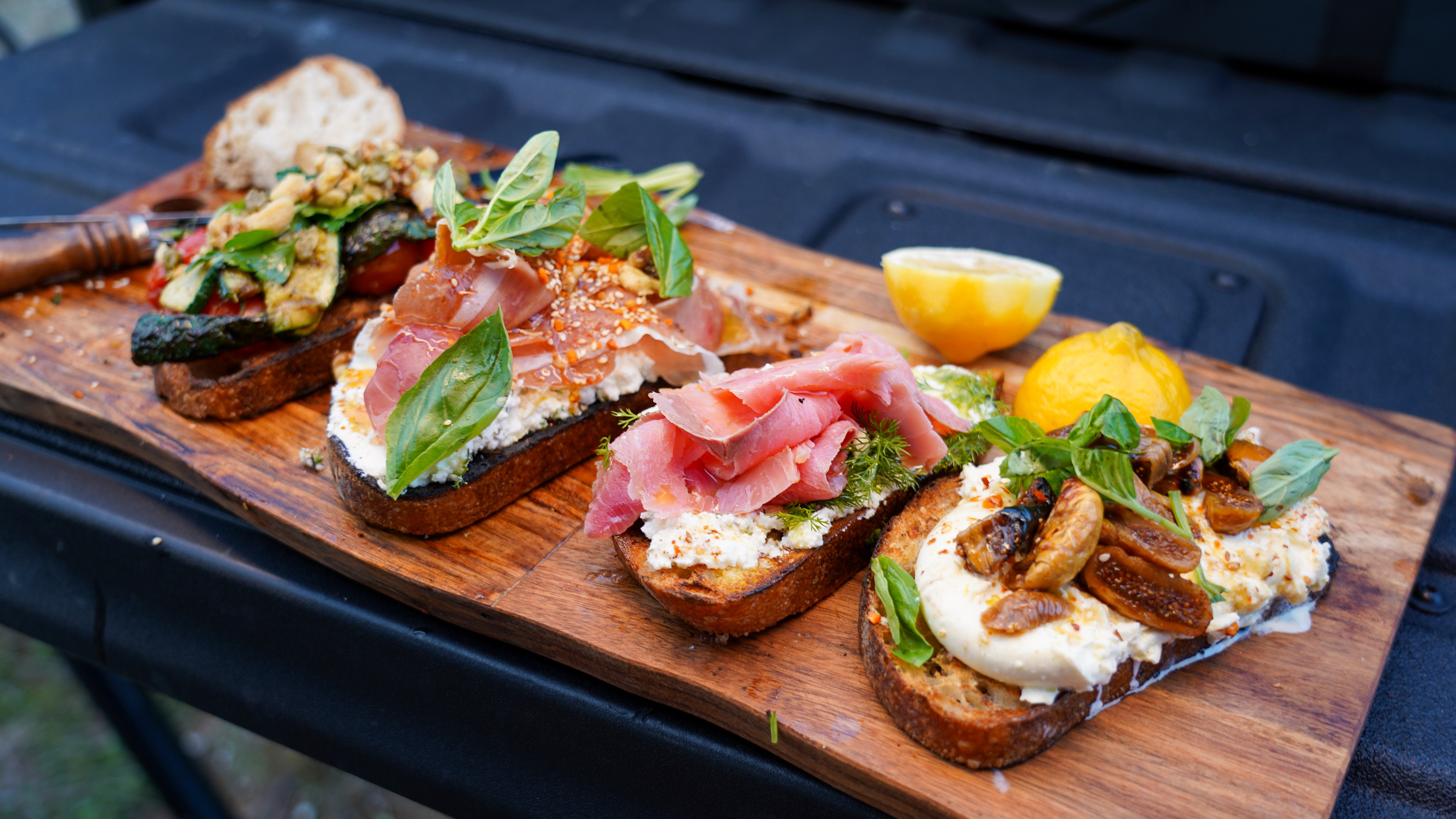 Base of ricotta, then a slice of prosciutto. Drizzle chilli honey, sprinkle dukkah, and toss a few toasted walnut pieces on top for crunch. Best enjoyed with something cool in hand.